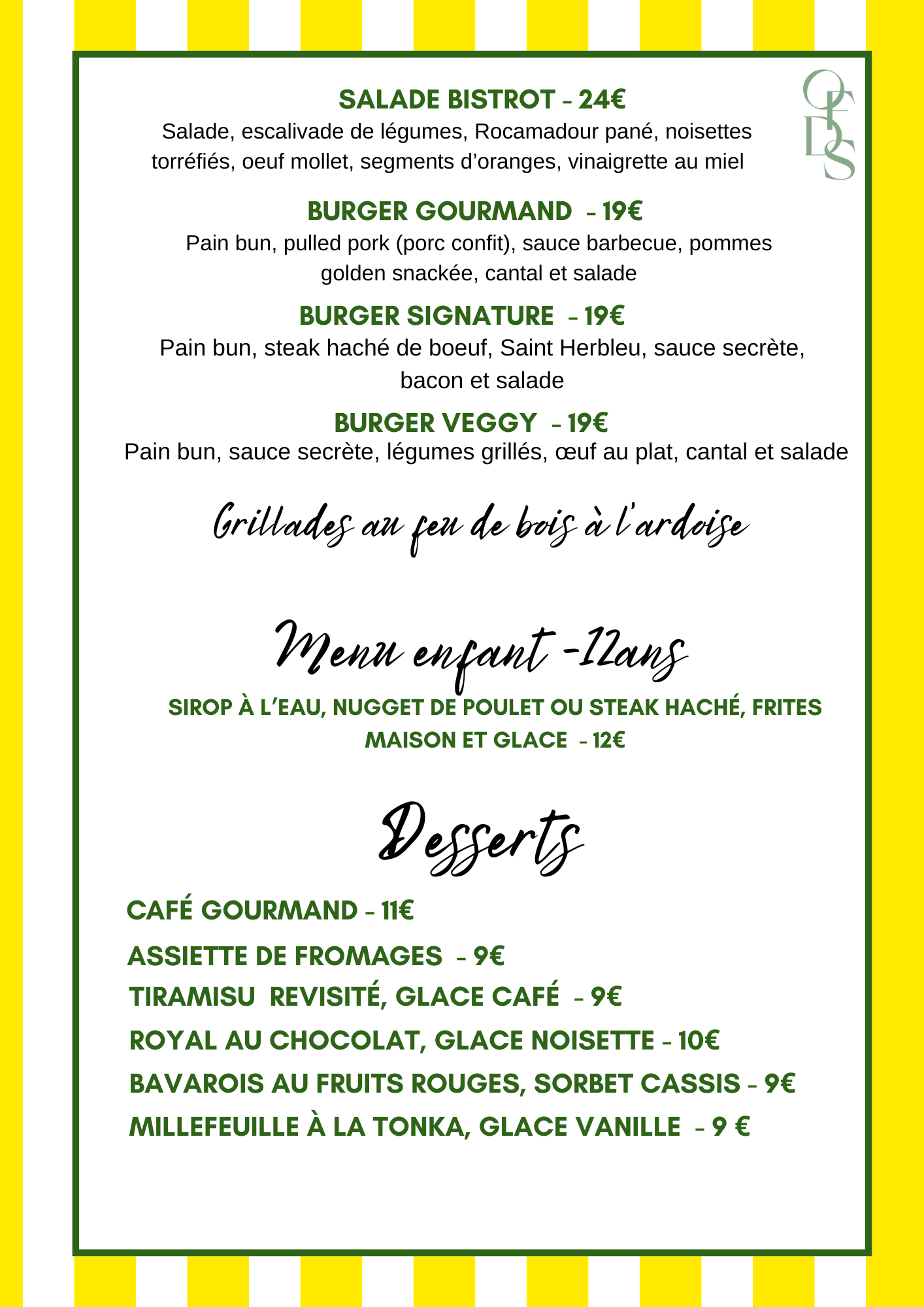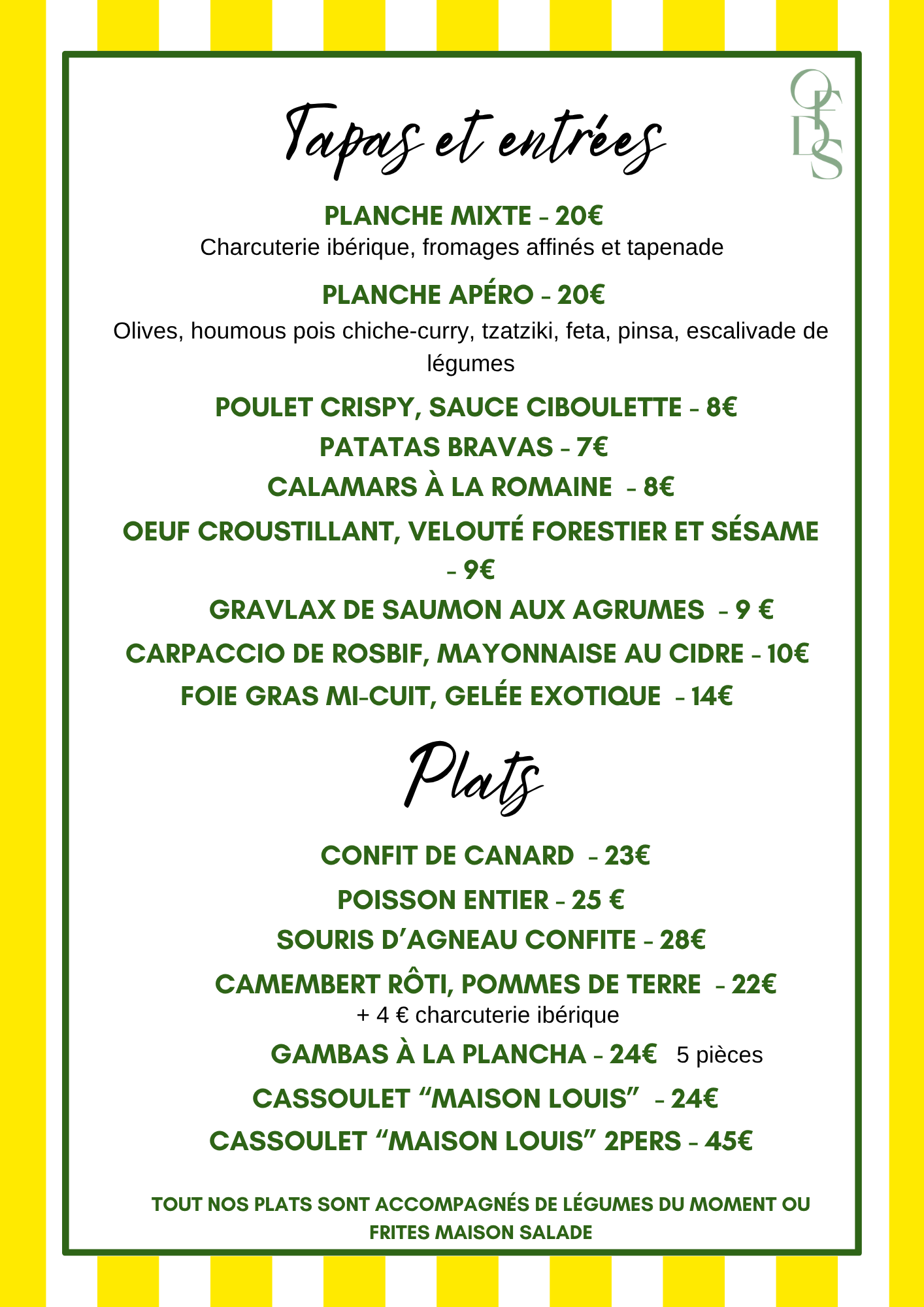 Du mardi au vendredi uniquement le midi nous vous proposons le menu du jour à 24€, qui varie tous les jours.